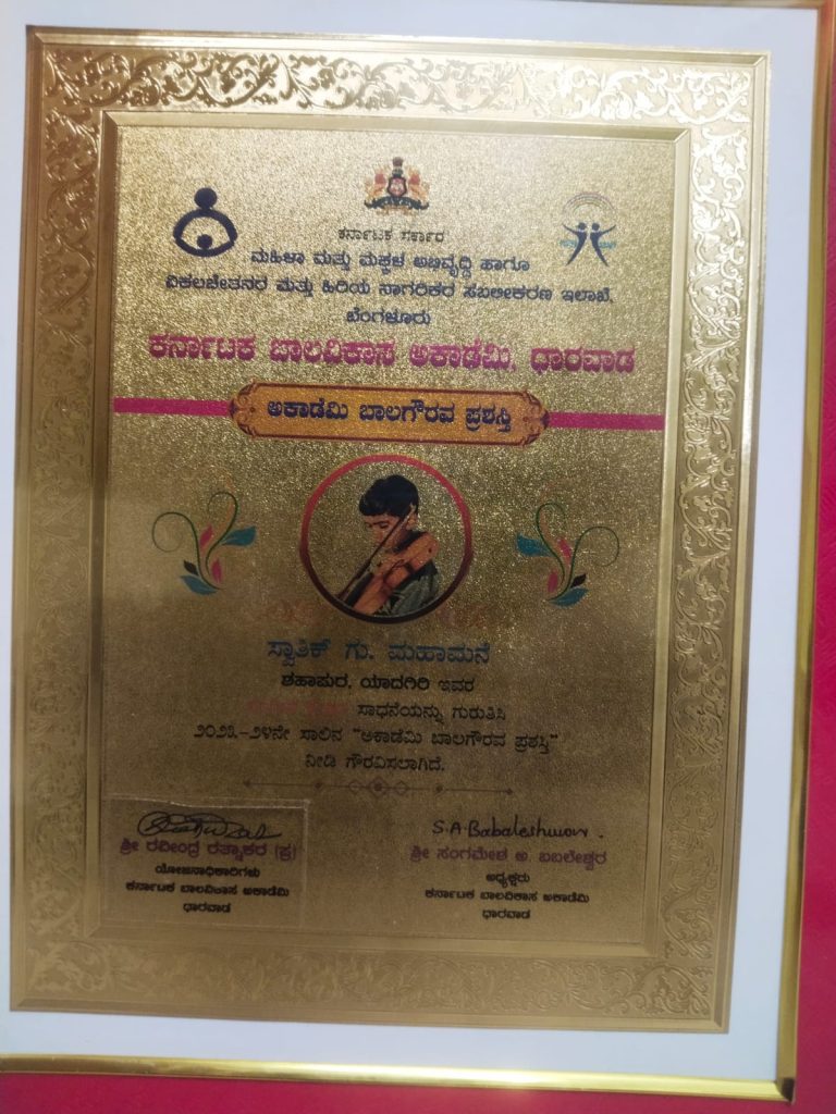 ಧಾರವಾಡ, ಡಿ.18: ರಾಷ್ಟ್ರೋತ್ಥಾನ ವಿದ್ಯಾಕೇಂದ್ರ – ಸತ್ತೂರಿನ ವಿದ್ಯಾರ್ಥಿ ಸಾತ್ವಿಕ್ ಮಹಾಮನಿ ಪಿಟೀಲು ವಾದನದಲ್ಲಿ ಅತ್ತ್ಯುತ್ತಮ ಸಾಧನೆ ಮಾಡಿದ್ದಕ್ಕಾಗಿ ಡಿಸೆಂಬರ್ 18, 2025 ರಂದು ಬೆಳಗಾವಿಯ ಐತಿಹಾಸಿಕ ಸುವರ್ಣಸೌಧದಲ್ಲಿ ಕರ್ನಾಟಕ ಬಾಲ ವಿಕಾಸ ಅಕಾಡೆಮಿಯಿಂದ ಪ್ರತಿಷ್ಠಿತ ಬಾಲ ಗೌರವ ಪ್ರಶಸ್ತಿಯನ್ನು ನೀಡಿ ಗೌರವಿಸಲಾಗಿದೆ.